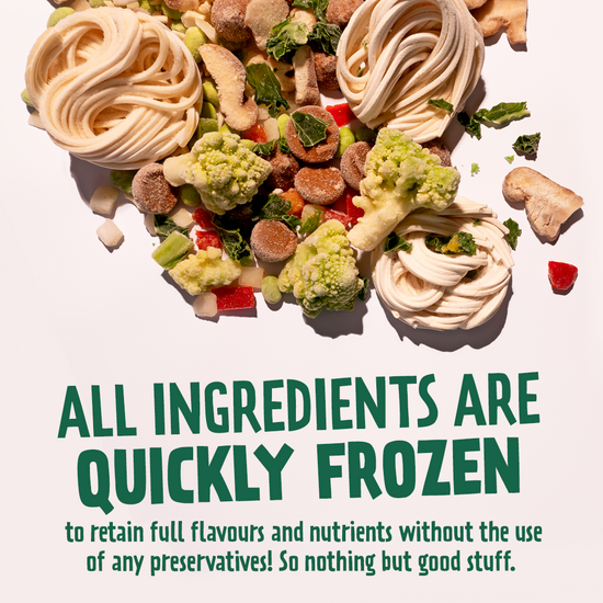 SCHNELL EINGEFROREN, UM DEN VOLLEN GESCHMACK UND ALLE NÄHRSTOFFE ZU BEWAHREN – GANZ OHNE KONSERVIERUNGSSTOFFE! NUR DAS BESTE ALSO.
